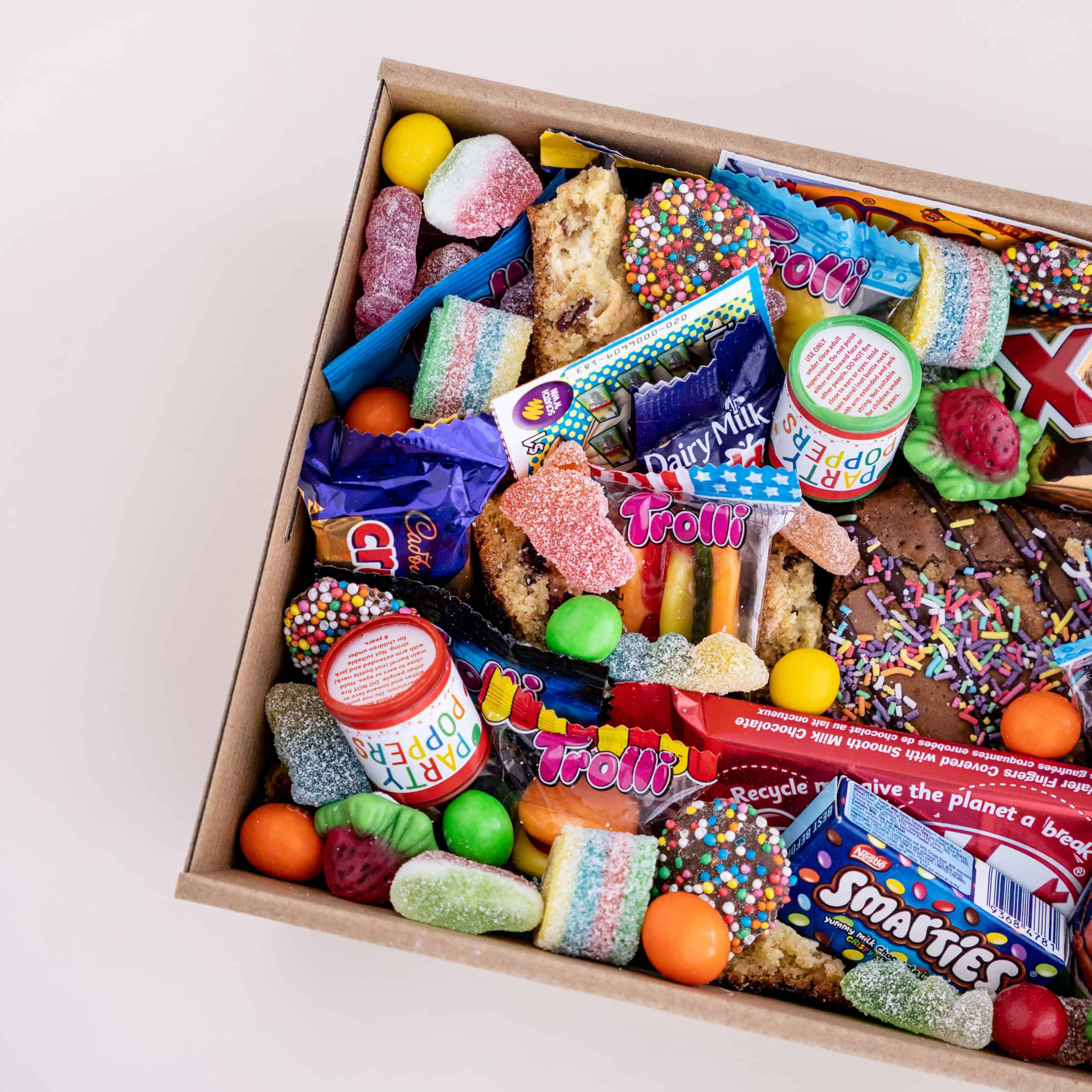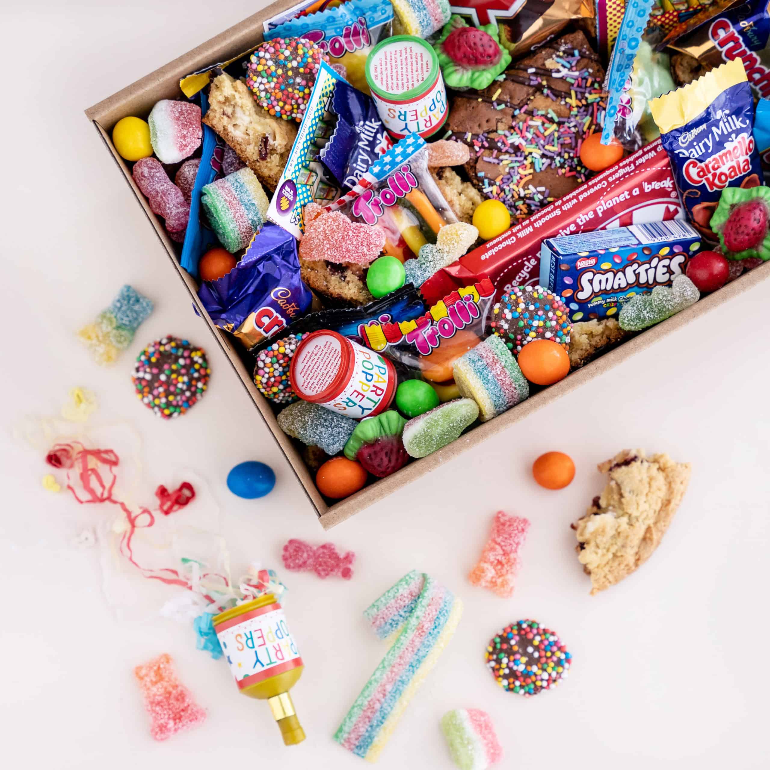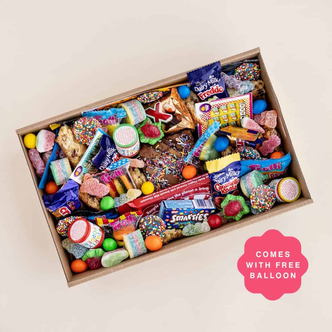 Make someone’s birthday extra special with this Birthday Special #1 dessert box. It includes a Happy Birthday balloon, a delicious brownie, scratchies for some fun, party poppers for celebration, chocolate bars, and a variety of mini chocolate bars, Trolli lollies, loose chocolate, and lollies. It’s the perfect gift to bring joy and sweetness to their special day.