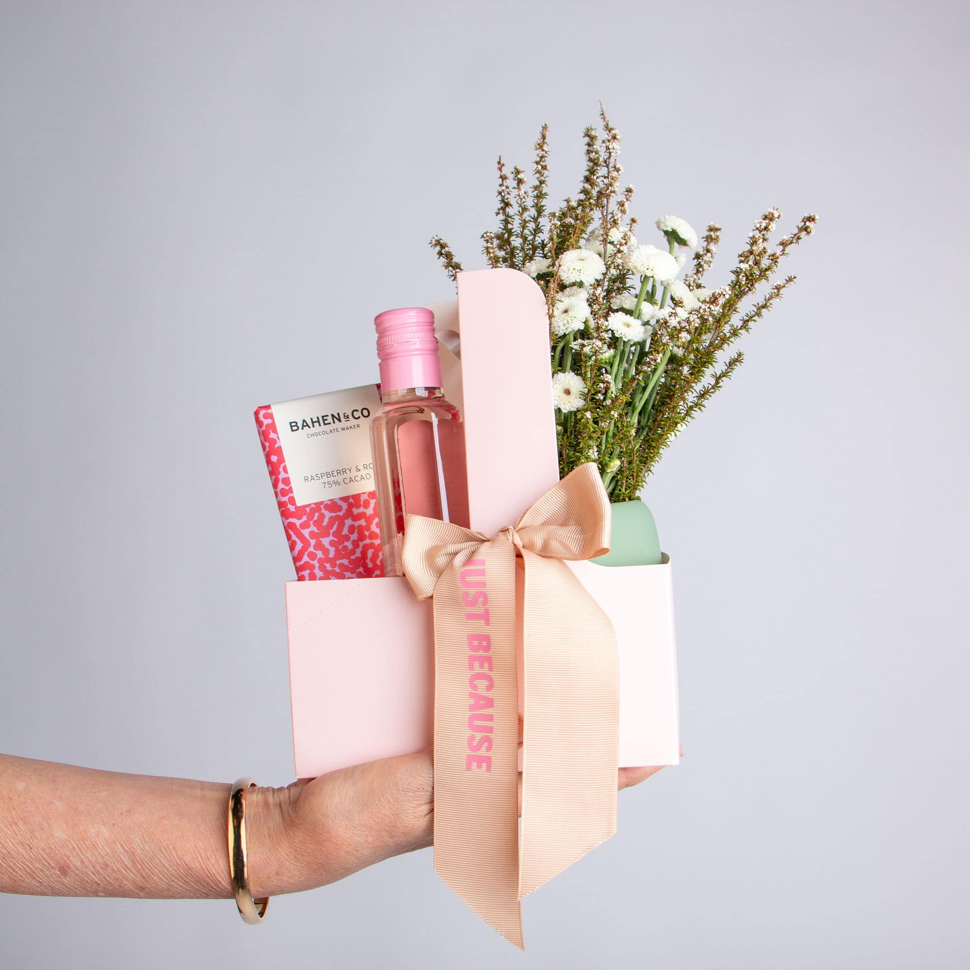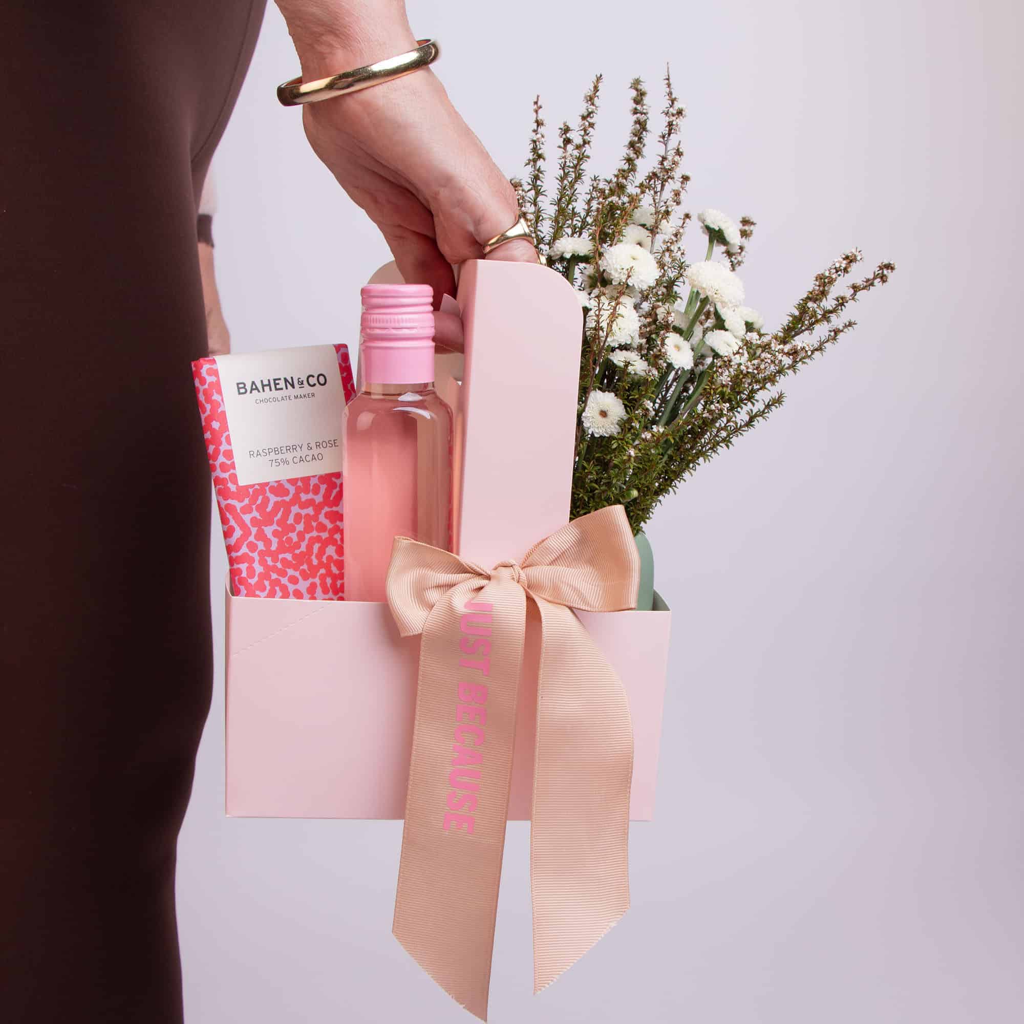 A beautiful wine and flowers gift featuring fresh seasonal blooms, Bahen & Co chocolate and your choice of wine, all presented in our signature pink gift caddy. Optional personalised ribbon available.